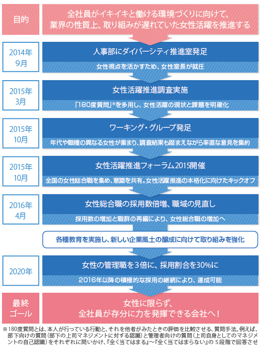 また、採用については、2016年4月の新卒採用(総合職のみ)のうち22%は女性という結果になりました。これは、優秀な人材を採用した結果自然とこうなっただけで、特に女性を意識して採用したわけではありません。今後もこの採用方式は変わりはなく、「2020年までに採用者に占める女性の割合を30%にする」という目標の達成は難しいものではありません。職群の再編と、総合職採用を増やすことにより、女性総合職の数はこの数年で現在の3倍程度にはなる見込みですから、そこから管理職になる社員も当然増えるでしょう。そして入社後は、成長する機会をしっかり提供する。つまり「量の拡大」と「質の向上」の2つのサイクルを継続的に回していけば「2020年に女性の管理職(課長職)を3倍にする」という目標も、達成できると考えています。