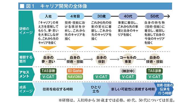 「入社時はキャリアに対する考え方を理解し、将来に対する自分自身の夢や思いを大事にする時期。4年目は自分の技術・技能における現状を分析し、これから先のキャリアを描く時期。50 代は自らの棚卸を通じて今後のキャリアを描く時期と考えています。それぞれの“節目”に意味があり、そこでどんな気づきを得て欲しいのかという“目的”によって、アセスメント・ツールを使い分けています」 同社が各節目で活用しているアセスメントについて詳しく見てみよう。