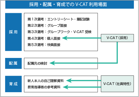 まずは採用時。エントリーから最終面接まで5つのステップがあるうち、3次選考のグループワークの段階でV-CATを受けてもらい、4次選考の個人面接でその結果を利用する。
