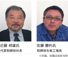 ものづくり現場で仕事ができる、伸びる人材についてうかがった。「誰が伸びる人材か、その潜在的な能力や才能を見抜くのは簡単ではありませんが、ものづくりの現場では機械と会話のできる人がいいですね。工場で毎日使っている機械の調子はどうかなと機械と会話しながら、稼働する機械の音に耳を澄まし、油の臭いを嗅ぎ分け、五感を研ぎ澄ましてちょっとした異常にも気づくような、そんな愛情とセンスをもった人が伸びるように思います」(近藤社長)、気づきのよくできる人が伸びます」(佐藤工場長)