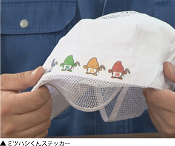 実は、工場内でかぶる帽子に工夫がしてある。帽子に、生産マイスターの等級ごとに色分けされた同社のキャラクター"ミツハシくん"のステッカーを貼り、個々の習得レベルを、全体で"見える化"。その結果、相手が何級を取得しているかがひとめでわかるため、円滑なコミュニケーションをとるのに役立っている。