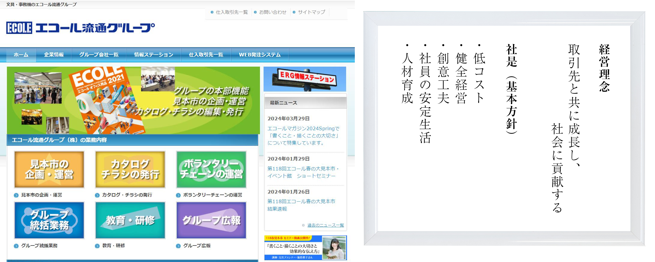 とくに社名(エコール=Ecoleはフランス語で「学校」の意)が示すとおり、社員教育には力を入れており、当社グループの経営の基本方針となる社是にも「人材育成」を掲げています。