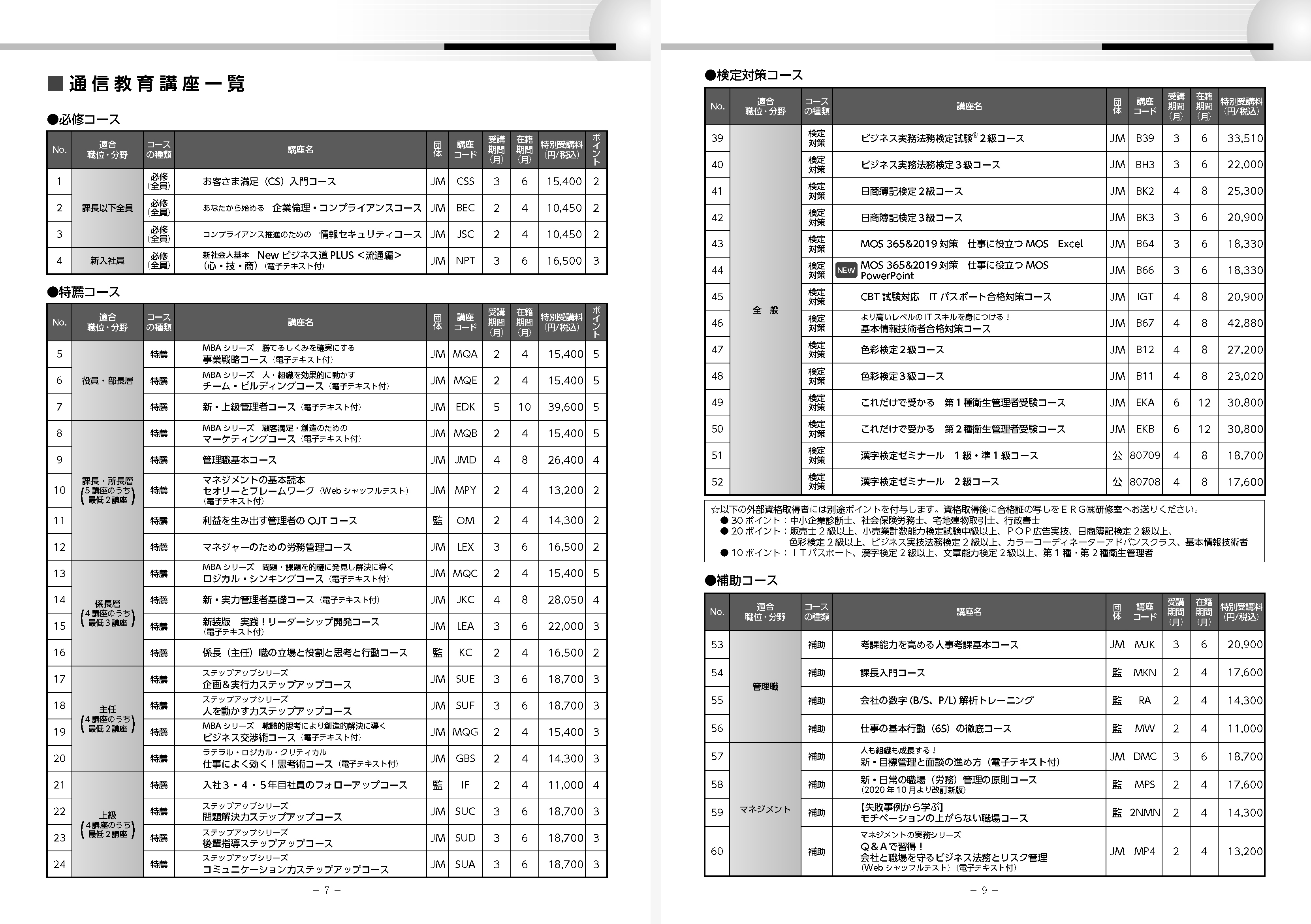 当社の通信教育では、社会人として必須であり全員が必ず修了しなければならない「必修」コースや、各職位に必要な基礎力を学ぶ「特薦」コース、各種資格検定のための「検定対策」コース、日々の実務やキャリアに役立つ「補助コース」など、計5コースを設けています。