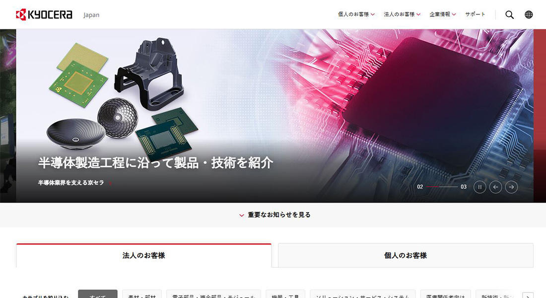 京セラの事業はブラウン管の絶縁部品として使われる小さなファインセラミックス部品から始まりました。その後、常に新しい技術の創造を追求する中で着実に事業範囲を広げ、現在では情報通信、モビリティ、環境・エネルギー、医療・ヘルスケアといった領域で多彩な事業を展開しています。