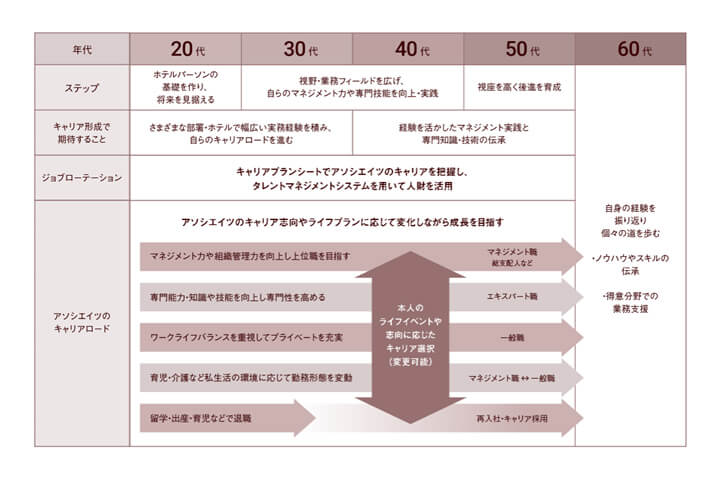 もちろん、10年後の姿を明確に持っている人もいれば、一歩一歩進みながら考える人もいます。以前はシェフやソムリエなどのエキスパート職を目指したいと思っていたけれども、途中からマネジャー職に進みたい、となる人もいます。各自の価値観や生活環境の変化に対応し、長く働き続けていけるよう、複線型のキャリアを選べるようになっています。