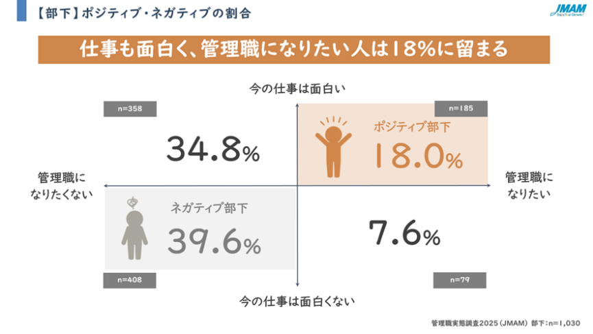 一般社員に対して「今の仕事は面白いか」「管理職になりたいか」を聞いた結果、「仕事が面白く、かつ管理職になりたい」と回答した「ポジティブ部下」は、全体の18.0%に過ぎなかった。一方で、「仕事は面白いが、管理職にはなりたくない」層は34.8%で2018年の調査と比べ+3.9ポイントと増加傾向にある。つまり、一般社員のワークエンゲージメントが高まる一方で、管理職志向は低下しているのだ。なお、「仕事も面白くなく、管理職にもなりたくない」層も39.6%と、管理職への忌避感は高い水準にある。
