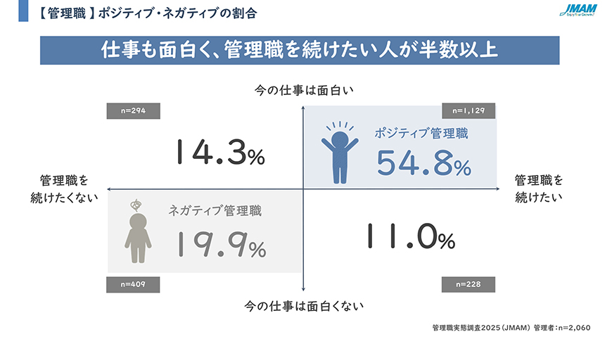 一方で、管理職に同じ問いを投げかけると、「仕事が面白く、これからも管理職を続けたい」と回答した「ポジティブ管理職」は54.8%に達した。ただ、「仕事は面白いが、管理職を続けたくない」層は14.3%で2018年の調査と比べ+5.5ポイントと増加傾向にあり、一般社員の結果と同じ状況にある。