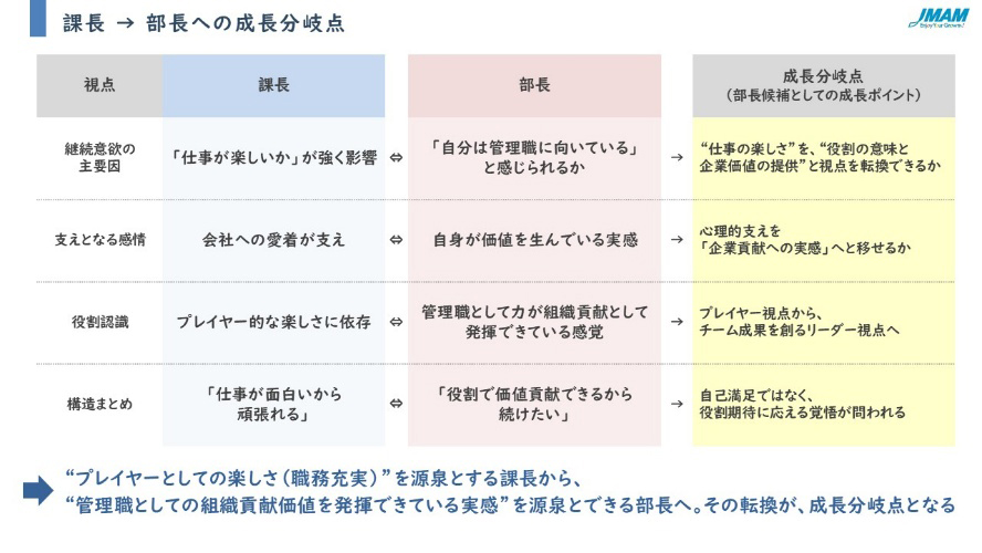 「課長は、今の仕事が楽しいかどうかがモチベーションに大きく影響し、会社への愛着が支えとなっています。一方、部長は自分が管理職に向いている、企業に貢献できていると実感することで、管理職の継続意欲が湧いています。つまり、『プレイヤーとしての楽しさ(職務充実)』を源泉とする課長から、『管理職としての組織貢献価値を発揮できている実感』を源泉にできる部長にしていくことが、成長分岐点の重要なポイントです」