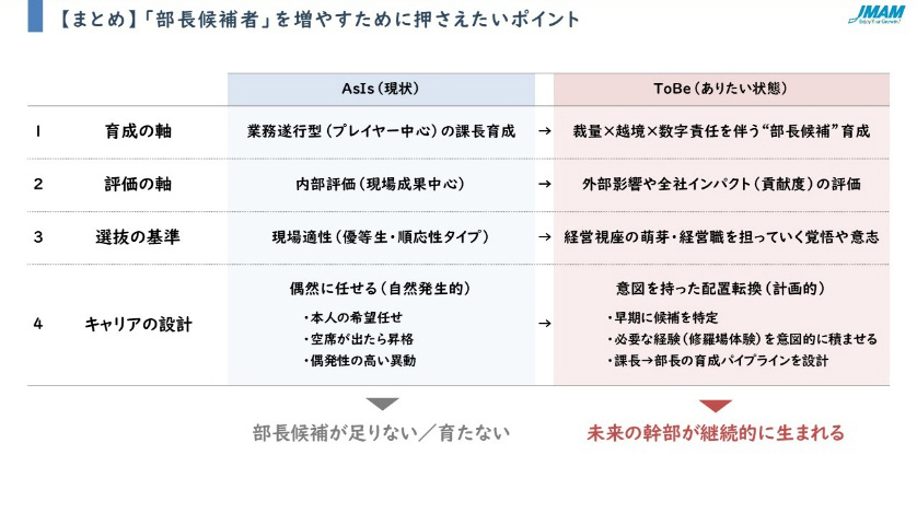 「管理職に負荷がかかる既存の育成施策では、なかなか部長層は育ちません。育成・評価・選抜・キャリア設計のそれぞれで、未来の幹部が継続的に生まれる環境をつくってほしいと思います」
