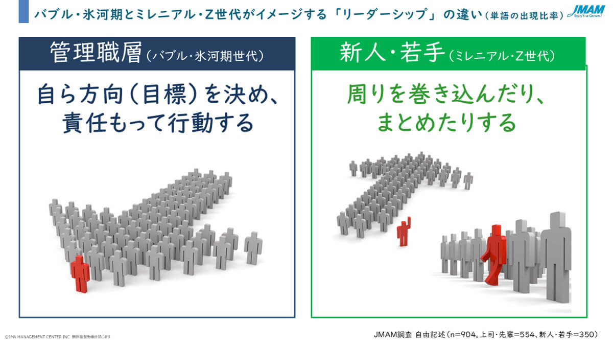 JMAMが定期的に実施しているビジネスパーソン調査の結果によると、40代以上、いわゆるバブル世代や就職氷河期世代の層にリーダーシップのイメージを自由記述形式で聞くと、「責任」「部下」「向かう」「示す」といった、力強く組織をけん引する言葉が多く挙がった。一方、20代・30代の若手層に同じ質問をすると、「まとめる」「立つ」といった言葉が目立った。つまり、バブル・氷河期世代にとってのリーダーシップは「自ら方向を決め、責任をもって行動すること」だが、若手にとっては「周りを巻き込んだり、まとめたりする」ことがリーダーシップなのだ。