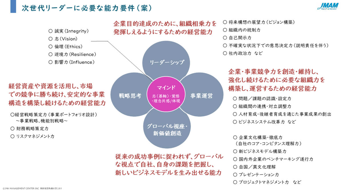 斎木氏は次世代リーダーに必要な能力要件として、誠実や志、倫理、逆境力、影響力といった「マインド」を中心に据え、その周りの要素として「リーダーシップ」「事業運営能力」「グローバル視座・新価値創造」「戦略思考」を提案した。一方で、経営層が次世代リーダーに期待する役割として、既存事業の延長線上にとどまらない新たな事業価値の創造を挙げ、「自社のコア技術・強みを見据えながら、コア事業の改革と新規事業創出を同時に推進する『両利きの経営』が不可欠である」と強調した。