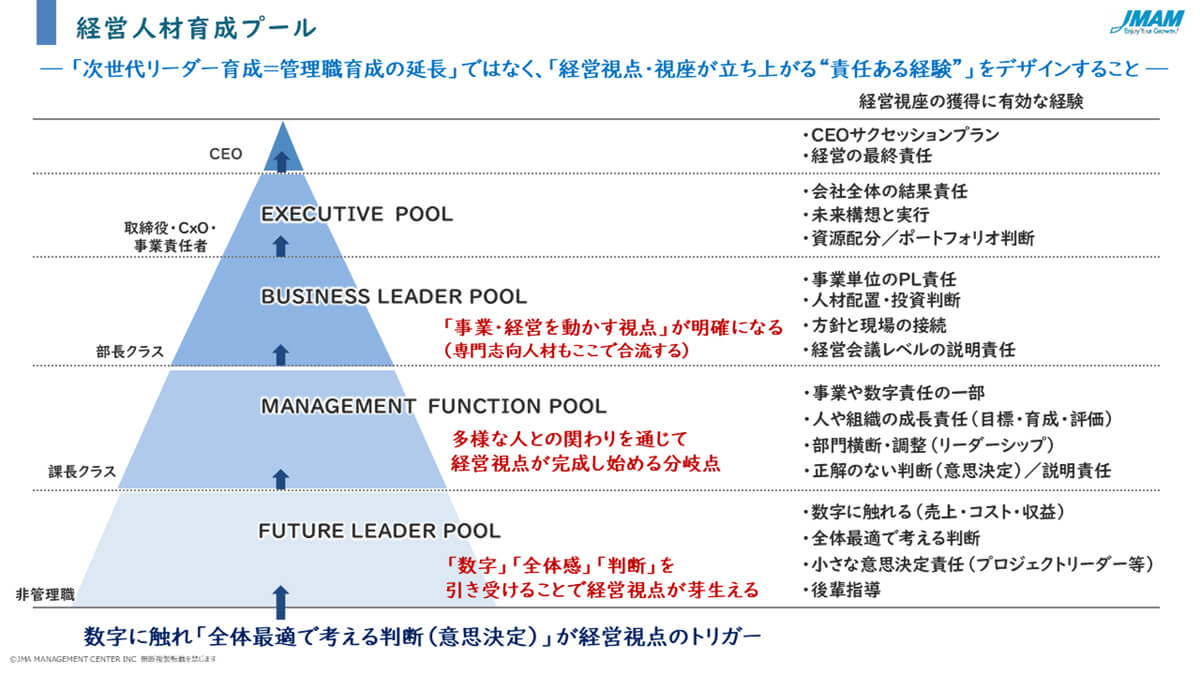 「経営視座を持つリーダーは、数字の話、人の話、戦略の話をバラバラに語りません。『この戦略を実現するために、この人材をどう配置し、どのような投資を行って、いつまでに決断するか』というように、全てをリンクさせて語ります。育成段階では、これらの要素を統合的に経験させるアサインメントこそが重要です」