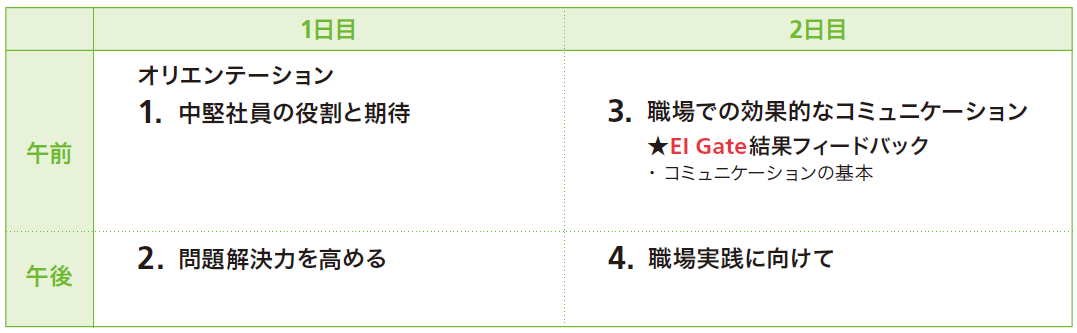 研修プログラムは、自分の役割・チームでの役割・お客様からの期待・今後の自分を考えさせる内容となっています。中堅社員になっていく節目として、EI Gate®による客観的な気づきをとても大切にしています。