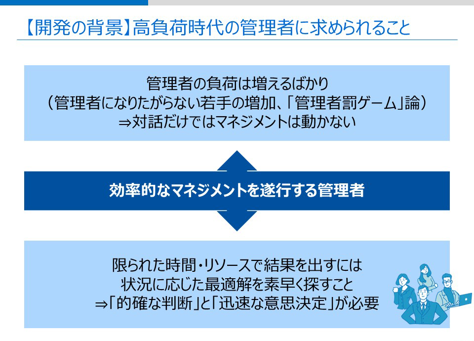 管理者には、的確な判断と迅速な意思決定をすることで、「効率的なマネジメント」を実践することが求められています。この研修は、正解のないさまざまなマネジメント課題に対峙するために、「自身の判断の傾向・特徴を明らかにし、組織に望ましい影響を与える」ことを目的としたトレーニング形式のプログラムです。