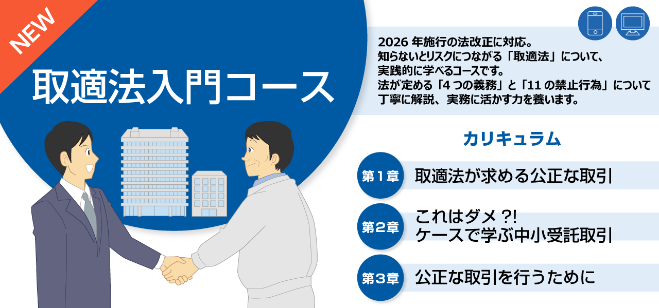 本コースは、2026年1月施行の「製造委託等に係る中小受託事業者に対する代金の支払の遅延等の防止に関する法律(略称:中小受託取引適正化法/通称:取適法)」 に対応し、改正内容に取引ルールを具体的に学べる構成です。