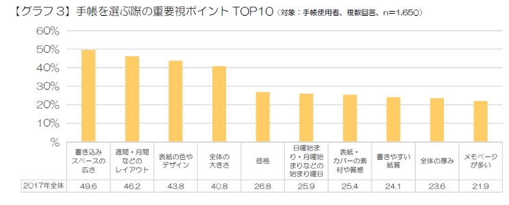 手帳ユーザーが手帳選びの際に最も重視しているのは「書き込みスペースの広さ」で49.6%だった。2位には「週間・月間などのレイアウト」、3位には「表紙の色やデザイン」がランクインした。