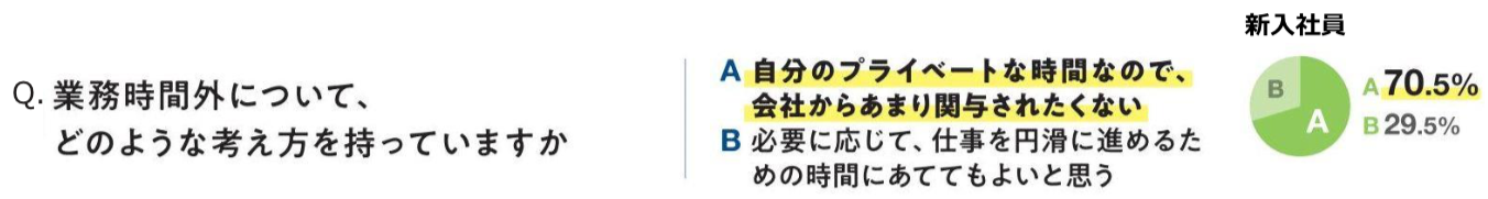 ・新入社員の70.5%が「業務時間外はプライベートな時間なので会社から関与されたくない」と回答。