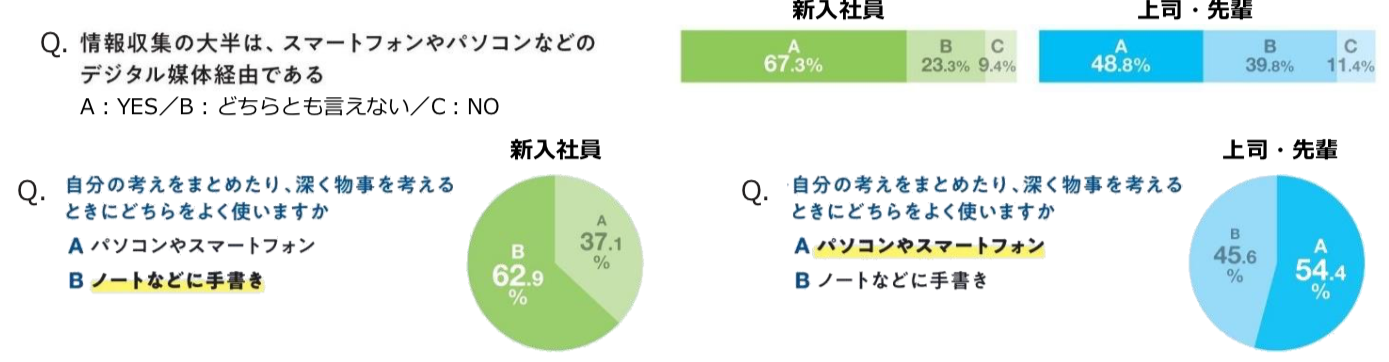 仕事のアウトプットについて、新入社員の情報収集はデジタルを駆使する一方(67.3%)、考えをまとめたり深く物事を考える際にはノートなどに手書きをする傾向にあり(62.9%)、上司・先輩社員よりも高い割合となりました。情報収集には素早く欲しい情報へアクセスできるデジタルを駆使し、考えを深めたり明確化するには手書きというように、意識的に使い分けているようです。