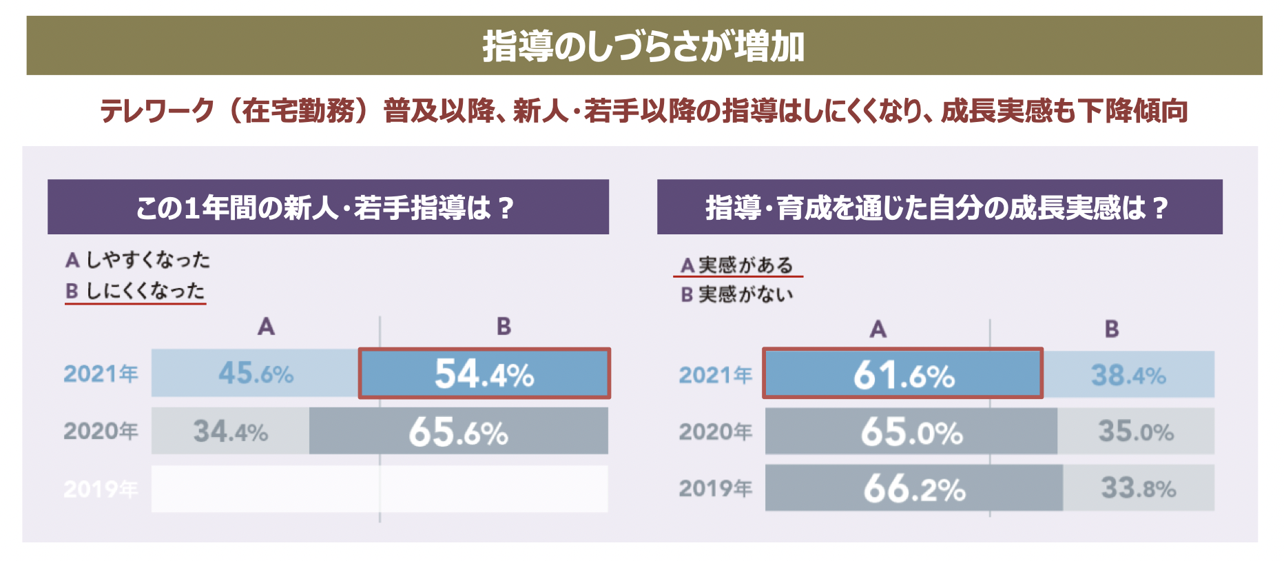 指導者の半数以上もテレワーク普及以降、「新人・若手以降の指導はしにくくなった」と回答しています。従来の成長支援を継続しても、指導者自身の成長も年々実感しにくくなってきている結果となりました。