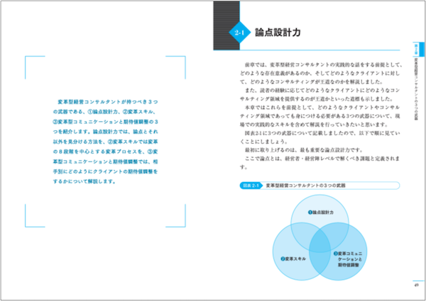 本書は、著者自身が現場で感じた新たなクライアントニーズや、コンサルタントに求められる新たな役割を、実践的内容としてまとめた教科書です。一般的なビジネスフレームワークを解説するようなコンサルティング関連書は多数ある中、本書では「変化の時代に、いかにクライアントを変革に導くか」という、VUCA時代に求められる経営コンサルティングの勘所を押さえられるように、最新のスキルと技・知識を伝授しています。抽象論で終わらず、クライアントの懐に入り込み、課題を解決するための具体的なメソッドを学ぶことができます。