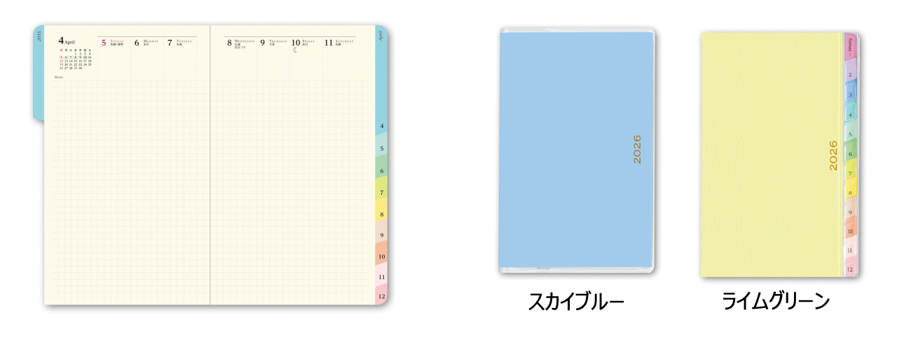日曜始まりは、一般的な壁掛けカレンダーと同じ形式で使えることから、特に女性を中心に人気が高く、家族や仕事の予定を自然に整理しやすい点が支持されています。新たに「ペイジェムウィークリーコンパクト-i」シリーズにラインナップされたのは、スカイブルーとライムグリーンの2色展開。明るくやわらかなカラーで、毎日の記録が楽しく続けられる一冊です。