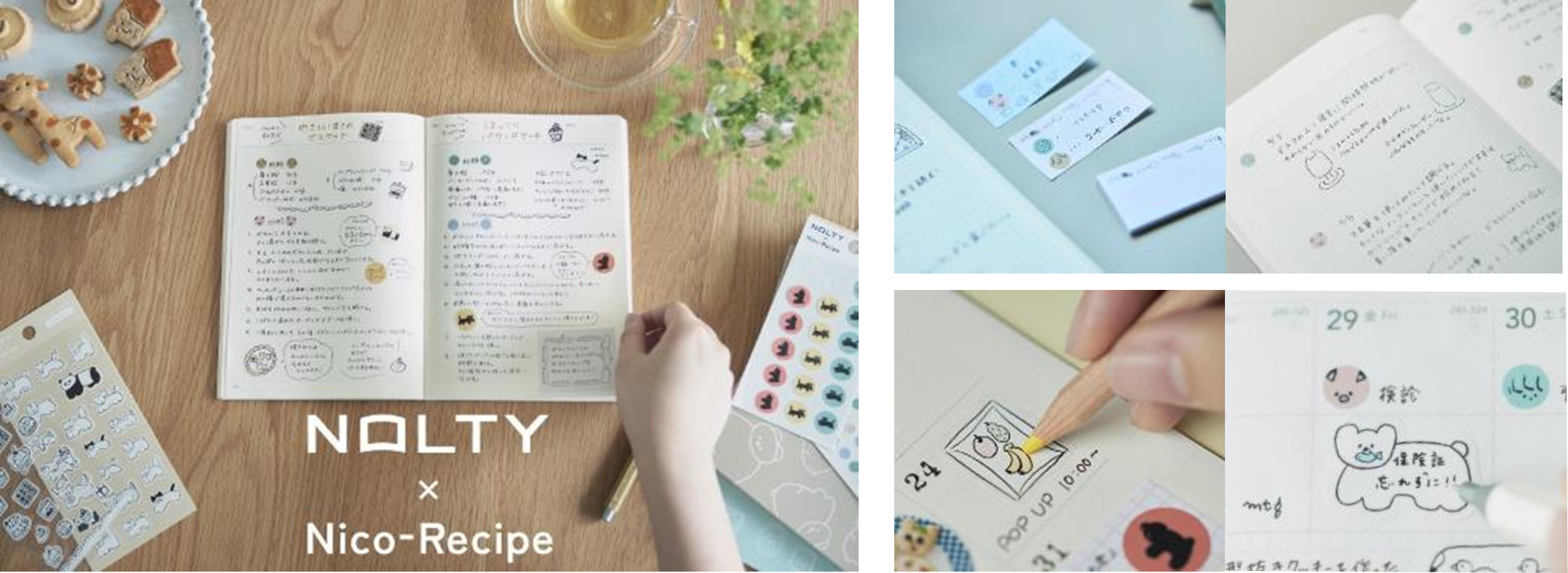 手帳づくりのノウハウを生かしたNOLTYノートと、はんこ作家・Nico-Recipe(ニコレシピ)さんのコラボレーションシリーズ。どこかやさしく、楽しいデザインで「書く時間」をもっとワクワクさせてくれます。シールや付箋など、彩りを添えるデコアイテムもご用意。手帳と組み合わせて使うのもおすすめです。