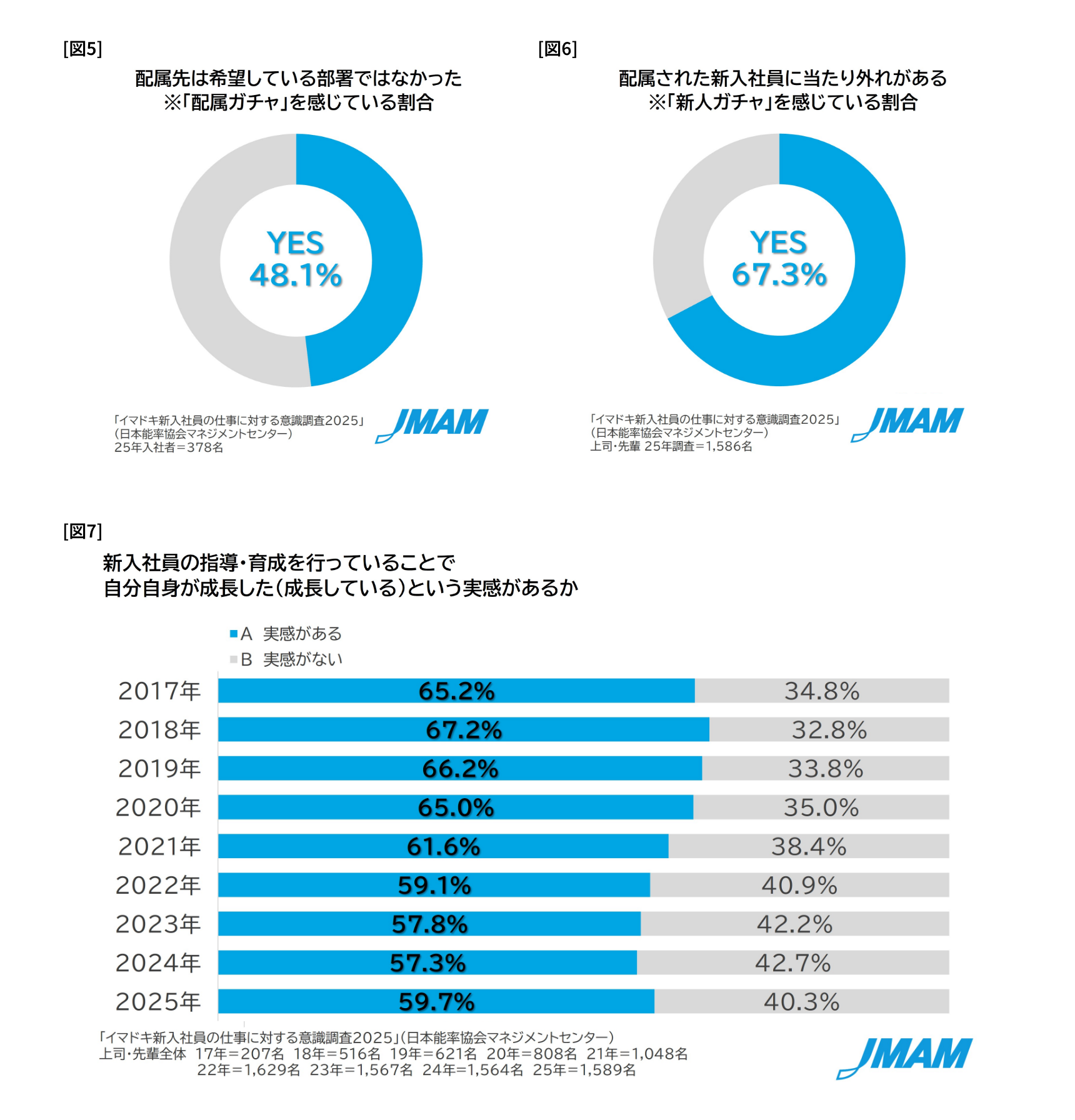 希望する部署や勤務地に配属されなかった、いわゆる「配属ガチャ」を感じた新入社員は48.1%でした<図5>。一方、配属された新入社員に当たり外れがある、いわゆる「新人ガチャ」を感じた上司・先輩社員は67.3%でした<図6>。人材不足かつ売り手市場により、採用競争が激化するなか採用した貴重な新入社員にも関わらず、現場では育成に翻弄される上司・先輩社員の様子がうかがえる結果となりました。また、新人指導を通じた上司・先輩社員自身の成長実感は59.7%と、2018年をピークに下降傾向にあり、現場の「育成疲労」が垣間見える結果となりました<図7>。