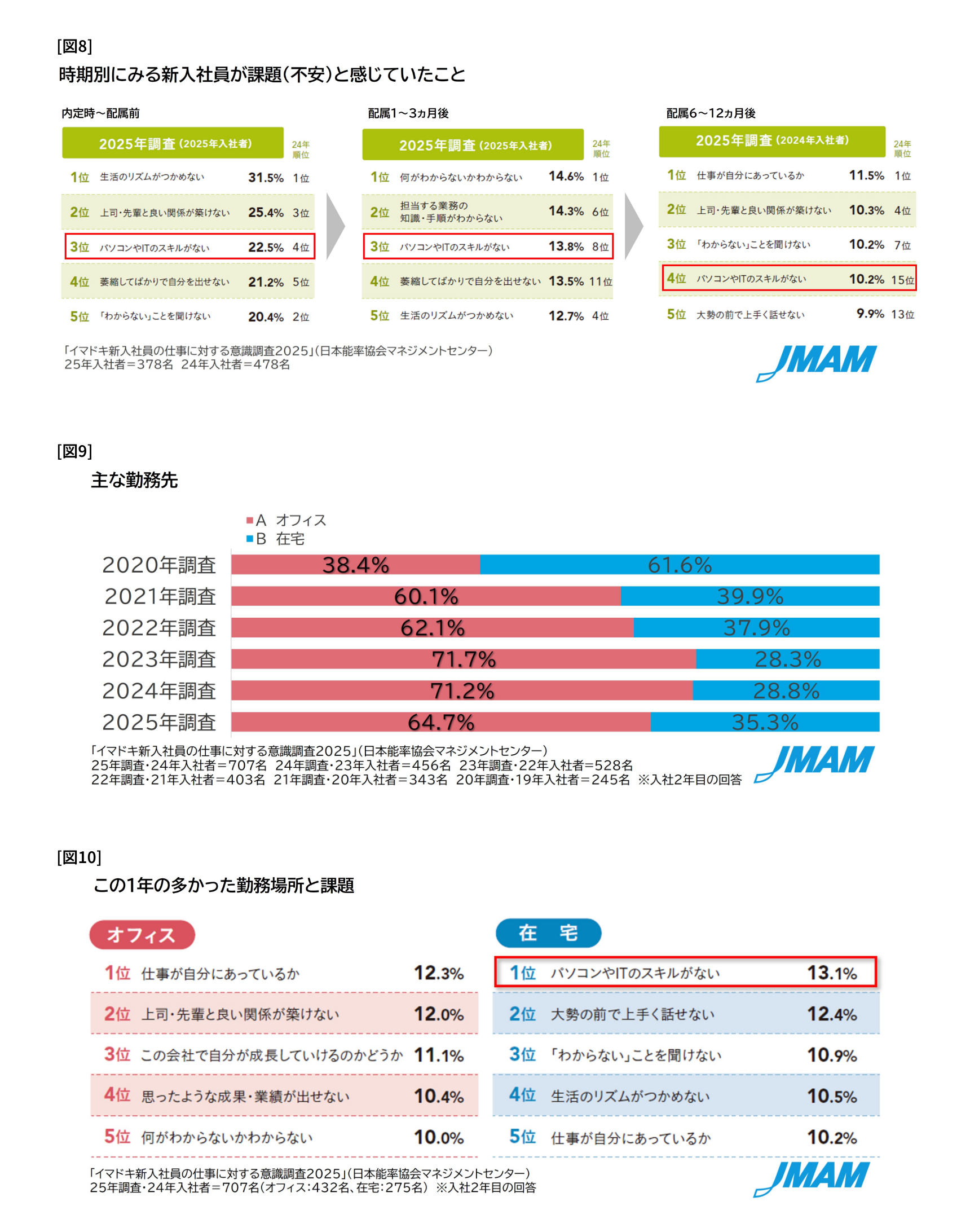株式会社日本能率協会マネジメントセンター(代表取締役社長:張 士洛、東京都中央区、以下JMAM[ジェイマム])が展開する企業・個人向けの教育・研修メニューを提供する人材育成支援事業部では、2024年から2025年に入社した新入社員と、新入社員の育成に関わる上司・先輩社員計2,674名を対象に「イマドキ新入社員の仕事に対する意識調査2025」を実施しました。本調査は2016年から開始し、今回で10回目を迎えました。