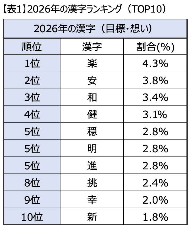 ■2026年への想いを表す漢字 第1位は2025年に引き続き「楽」