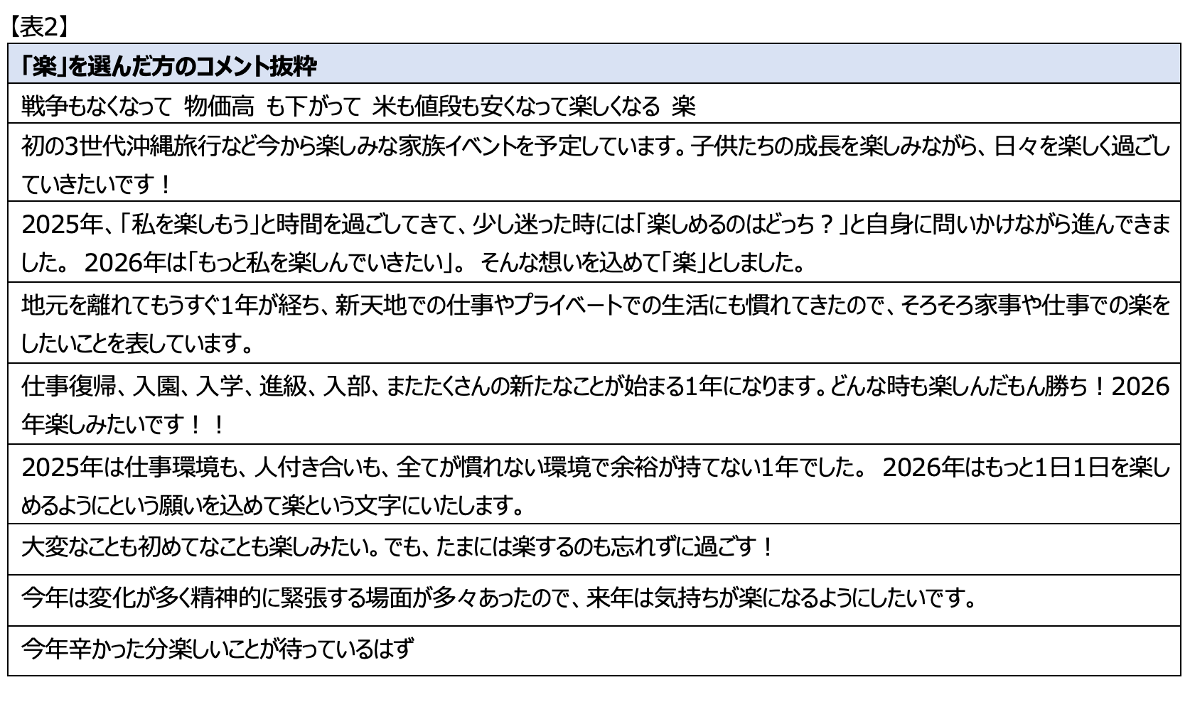 2026年への目標や想いを表す漢字として、昨年に続き2年連続1位となった「楽」。この漢字は「たのしい」と「らく」の二つの読みと意味を併せ持っており、①明るく充実した1年を“楽しみたい”前向きさと、②心身・経済的負担を“ラク”にしたい切実さの双方を同時に表現できる漢字であると言えます。コロナ禍や物価高など“重い”数年を経験したからこそ、来年こそは「明るさ」と「ゆとり」の両方を取り戻す1年にしたいという切実な思いが、「楽」を選んだ方のコメントからも読み取れます。【表2】