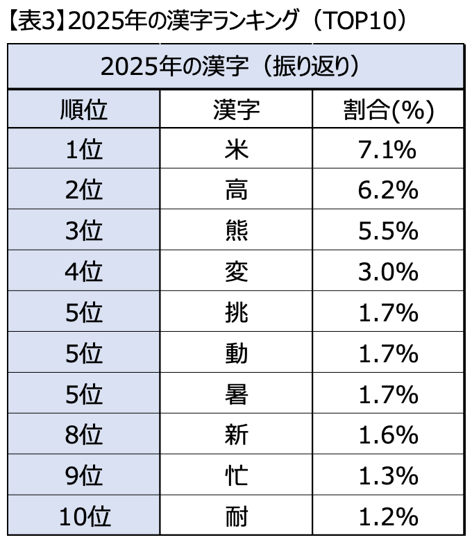 『2025年を表す漢字』の1位は圧倒的に「米」(応募総数における割合:7.1%)、2位は「高」(6.2%)、3位は「熊」(5.5%)となりました。【表3】