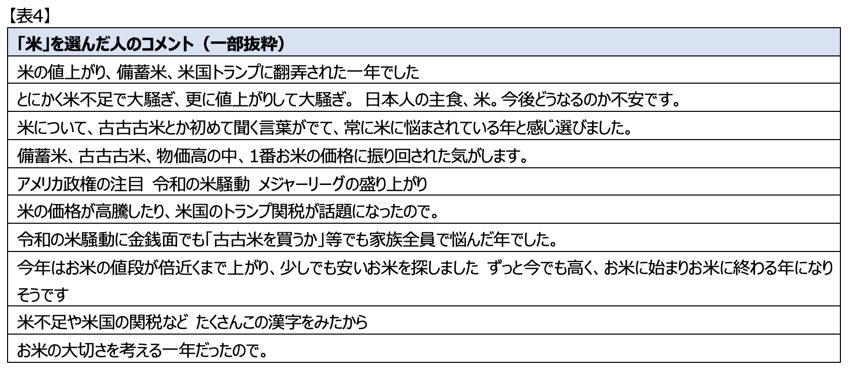 1位の「米」が選ばれた背景には、主食であるコメが不足・高騰した “令和版米騒動” に加え、トランプ関税など「米国(アメリカ)」発のニュースが世界経済に大きな影響を与えたことが挙げられます。【表4】