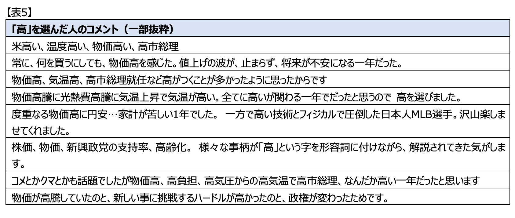 2位の「高」は昨年に続くランクインですが、今年は物価・金利などが “高い” という生活実感に加え、日本初の女性首相となった「高市早苗」氏の名字を想起して投票した人が多かった点が特徴的でした。【表5】